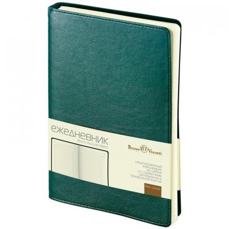 Ежедневник едатированный А5, цвет обложки — зеленый, 272 страницы, размеры: 135x215 мм. Листы бежевого цвета в линейку с плотностью 70 грамм. Обложка кожзам, с рельефом кожи, реальный шов по контуру обложки. Есть карман из пластика для визиток.