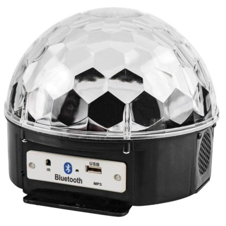 Светодиодная система ’Диско-шар’ с пультом дистанционного управления и функцией сопряжения через Bluetooth — устройство для создания эффекта светомузыки, которое поможет организовать веселую вечеринку там, где есть электрическая розетка. 6 ярких диодов RGB светятся разными цветами, а вращающийся купол разносит задорные блики. Диско-шар умеет подстраиваться под ритм звучащей музыки благодаря встроенному датчику. Можно воспроизводить треки прямо с устройства через USB-флешку. Изделие устанавливается на поверхности или монтируется на стену, потолок.Обращаем Ваше внимание, что элемент питания идет в комплекте.