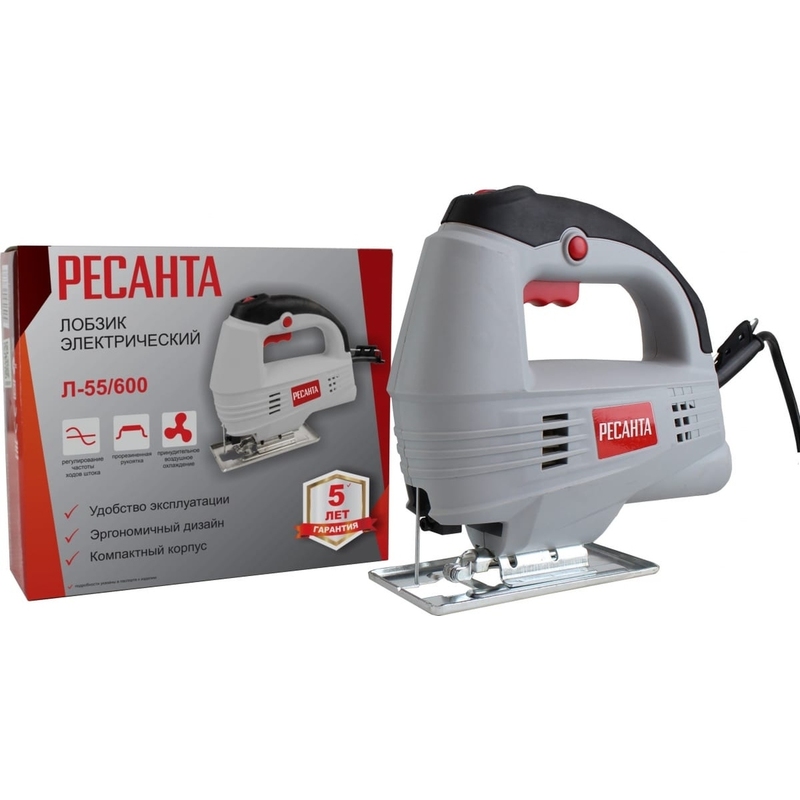 Лобзик электрический (электролобзик) Ресанта относится к ручному инструменту, оснащенному электрическим приводом. Небольшие габариты инструмента сказываются на его весе, который, практически, не ощущается.Предназначение электролобзика заключается в выполнении большого количества операций как по продольной и поперечной резке листового материала, так и по фигурной. С помощью агрегата можно быстро и качественно выполнить следующие виды работ:- прямые резы таких материалов, как дерево, пластмасса, гипсокартон, металлический лист, ламинат, керамическая плитка и др.;- криволинейный рез любого из перечисленных выше материалов;- резка круглых отверстий нужного диаметра;- резка отверстий прямоугольной формы.Электрический лобзик Ресанта Л-55/600 — отличается очень низкой стоимостью и относится к бытовым лобзикам. При этом имеет плавную регулировку скорости для распила различных материалов c высокой точностью и ’чистым резом’. Также есть регулировка угла наклона подошвы +45° и кнопка фиксации выключателя для продолжительного пиления.