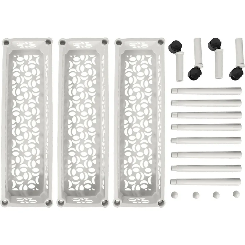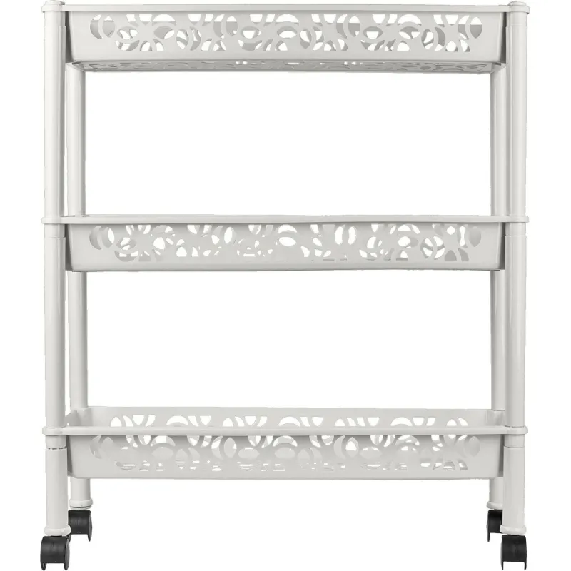 Этажерка на колёсах прямоугольная — это эффективное и недорогое решение для организации хранения в небольших помещениях, на кухне, в ванной, на балконе или лоджии, в кладовой или на даче. Отличительная особенность этажерки — она узкая и вытянутая, отлично экономит пространство, её ширина всего 180 мм. Напольная этажерка состоит из трёх полок с небольшими бортиками. Габариты этажерки в собранном виде 580×180×690 мм. Она собирается без инструментов за несколько минут, достаточно соединить стойки и полки, вставить опоры и заглушки. На нижних опорах предусмотрены колёсики, её легко выдвигать и устанавливать на место. Оригинальный дизайн. Расстояние между полок — 25 см.