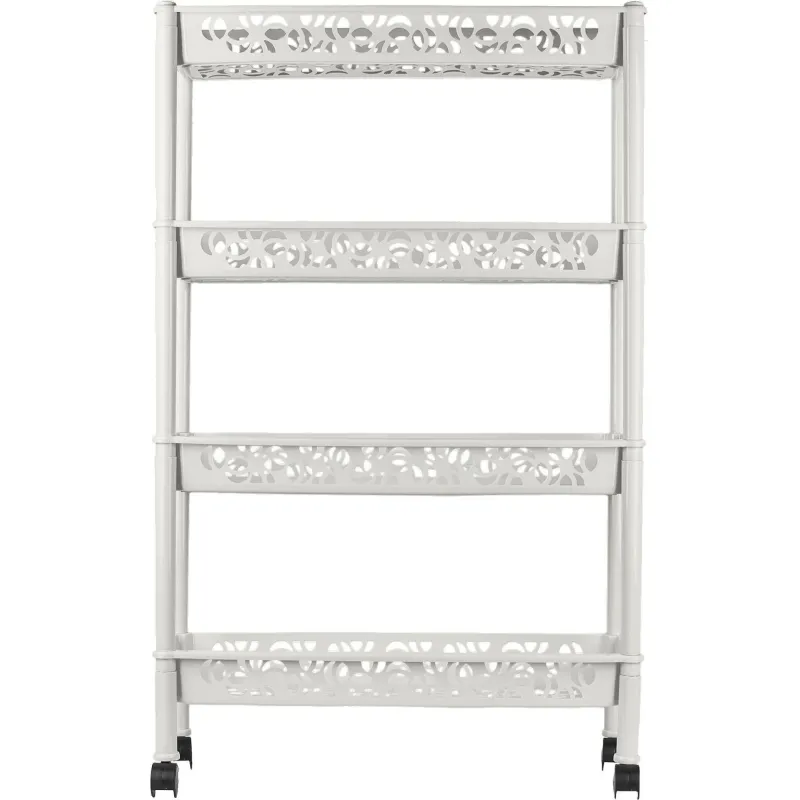 Этажерка на колесах прямоугольная — это эффективное и недорогое решение для организации хранения в небольших помещениях, на кухне, в ванной, на балконе или лоджии, в кладовой или на даче. Отличительная особенность этажерки — она узкая и вытянутая, отлично экономит пространство, ее ширина всего 180 мм. Напольная этажерка состоит из четырех полок с небольшими бортиками. Габариты этажерки в собранном виде 580×180×935 мм. Она собирается без инструментов за несколько минут, достаточно соединить стойки и полки, вставить опоры и заглушки. На нижних опорах предусмотрены колесики, ее легко выдвигать и устанавливать на место. Оригинальный дизайн.
