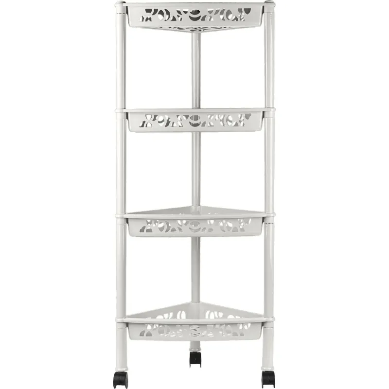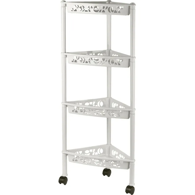Этажерка на колесах угловая — это эффективное и недорогое решение для организации хранения в небольших помещениях, на кухне, в ванной, на балконе или лоджии, в кладовой или на даче. Напольная этажерка состоит из четырех полок с небольшими бортиками. Габариты этажерки в собранном виде 383×222×935 мм. Она собирается без инструментов за несколько минут, достаточно соединить стойки и полки, вставить опоры и заглушки. На нижних опорах предусмотрены колесики, ее легко выдвигать и устанавливать на место. Оригинальный дизайн.