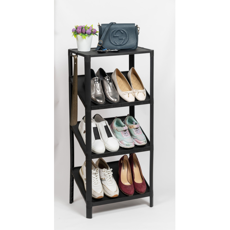 Подставка представляет собой четырёхсекционную узкую стойку с пластиковыми полками для размещения обуви, вещей и уличных аксессуаров. Открытый тип обувницы даст быстрый доступ к содержимому, а благодаря наклонной поверхности полок для обуви этажёрка получилась компактной и может поместиться даже в ограниченном пространстве квартиры. Полочки оснащены удобными бортиками по сторонам для исключения скатывания содержимого.