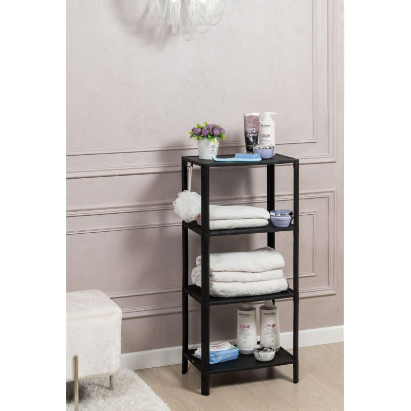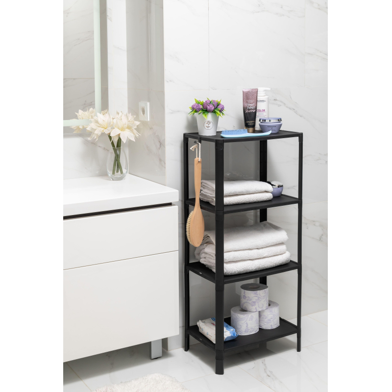 В комплект входит крючок, который можно прикрепить на любую из полок и даёт возможность повесить необходимые аксессуары. Стойки сконструированы таким образом, что при их монтаже создаётся надёжное соединение внутренним замком, что обеспечивает монолитность конструкции и даёт возможность легко поднять и переместить этажёрку за верхнюю полку. Каркас этажёрки выполнен из прочного пластика и не прихотлив в уходе — достаточно протереть влажной губкой или промыть под струёй тёплой воды.