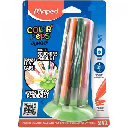 Фломастеры Jungle Innovation, 12 цветов. Красочная упаковка выполнена из цветного картона, имеется прозрачное окошко. В наборе — 12 фломастеров с длиной корпуса 140 мм и толщиной линии письма — 2 мм. В комплекте — эксклюзивная гибкая подставка, с внедренными в нее колпачками, которые таким образом не смогут потеряться. Фломастеры имеют яркие насыщенные цвета, легко смываются с кожи и тканей. Конусовидный стержень заблокирован и даже при сильном нажатии сохраняет форму.