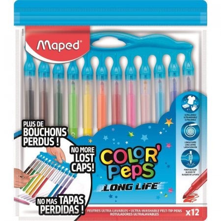 Цветные фломастеры для рисования на бумаге. Идеальны для детей от 3-х лет. Благодаря тому, что фломастеры на водной основе, они легко смываются с большинства материалов и кожи. Инновационное решение, чтобы никогда не терять колпачки, крышки интегрированы в мягкую и неразрывную основу. Компактные фломастеры не займут много места в школьном рюкзаке. Конусовидный стержень заблокирован и даже при сильном нажатии сохраняет форму. Толщина линии письма — 3.6 мм.