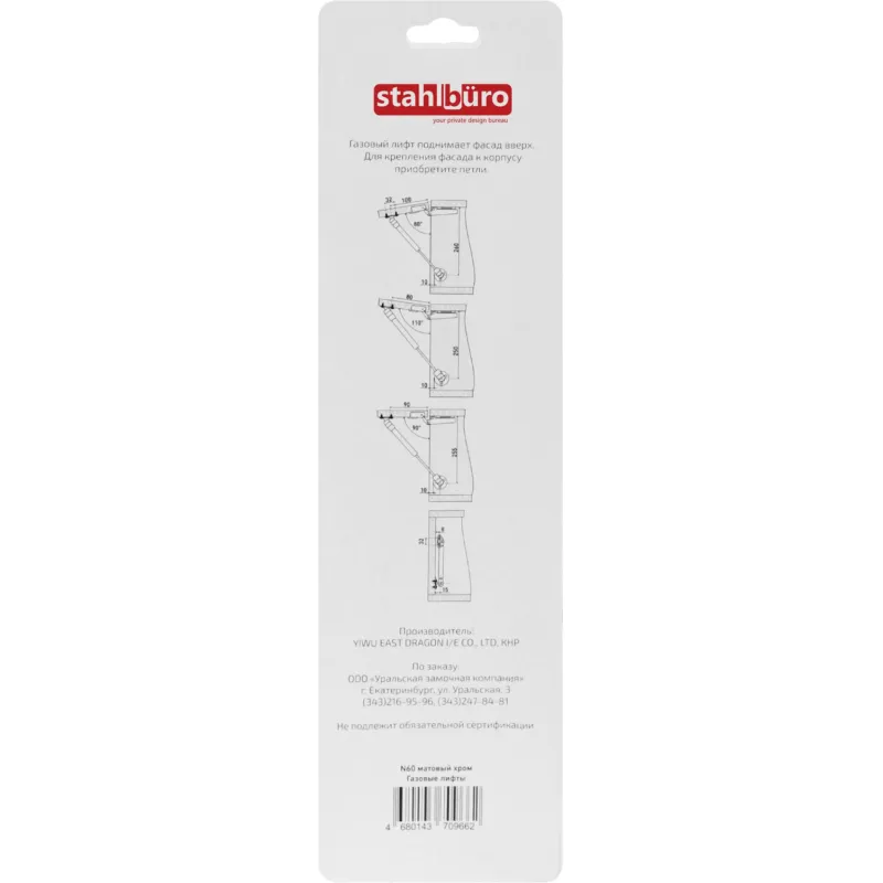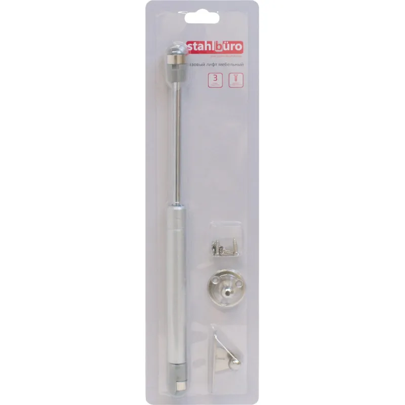 Доводчик StahlBuro N60 — это газовый лифт для верхних фасадов корпусной мебели. Модель может транспортироваться при температурном режиме от −20 до +30 градусов, но эксплуатация и установка возможны только при комнатной температуре. Газовый лифт поставляется в комплекте с двумя кронштейнами — для крепления к боковой стенке корпуса и к мебельному фасаду.
