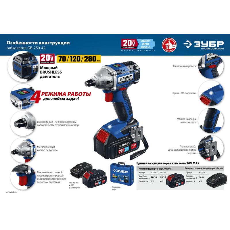 Профессиональное изделие с передовым BRUSHLESS двигателем обеспечивает крутящий момент до 280 Нм и высокую производительность благодаря двум емким батареям. Полностью программно-управляемый двигатель способен работать с различными уровнями крутящего момента (для сборки конструкций, закручивания колес, затягивания крупного крепежа), реализовывать дополнительные режимы работы и оптимально потреблять заряд при любой нагрузке