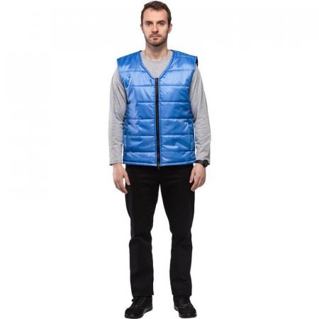 Жилет утепленный стеганный. Центральная застежка на молнию трактор № 5, прорезные карманы. Утеплитель: синтепон, 1 слой весом 200 г. Ткань «Оксфорд», плотность 110 г/кв.м. Размер: 60-62. Рост: 170-176. Цвет: васильковый.