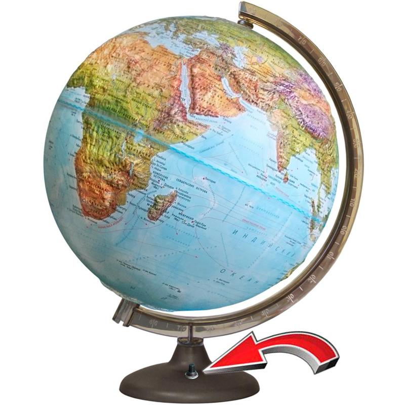 Глобус Земли рельефный с подсветкой вмещает в себя две карты: физическая и политическая. Рельефный макет глобуса представляет собой шар с выпуклостями всех географических возвышенностей. Физическая карта глобуса отображает все значимые географические объекты: материки, океаны и моря с указанием течений, горные хребты, плоскогорья и равнины, реки, озера. При включении подсветки физическая карта преображается в политическую. На ней вы сможете увидеть подробную карту, отображающую государства с их границами, столицами и основными административными центрами. При этом сохраняются обозначения географических объектов. Глобус отличается высокой точностью изготовления и яркостью цветов. Подсветка работает от батареек, включается удобной кнопкой, расположенной на подставке. Это обезопасит ваших детей и позволит установить глобус в любой точке помещения. Такой глобус становится оригинальным ночником в детской комнате.