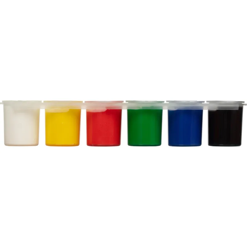 Цвета представлены в ассортименте, и каждый из них находится в пластиковой банке объёмом 15 мл. Общий объём краски в упаковке составляет 90 мл. Упаковка компактная и удобная для хранения, размеры которой 200×37×48 мм.