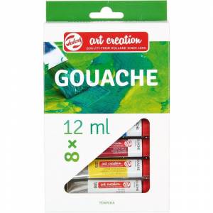 Набор гуаши Royal Talens Art Creation 8 тюбиков по 12 мл в картонной упаковке. Серия художественных материалов Art Creation — идеальный выбор для начинающих художников, студентов и учеников. Гуашь Talens Art Creation — простая в использовании: не растекается, позволяя работать тонко, не выходя за границы изображения. Гуашь легко разбавляется водой, затем быстро сохнет, становится матовой и непрозрачной, не теряя присущей ей интенсивности цвета. Можно использовать как на бумаге, так и на картоне и дереве. Размер: 18x11x2 см. Оригинальные названия цветов в наборе: White, Lemon Yellow, Deep Rose, Light Blue (Cyan), Deep Green, Yellow Ochre, Burnt Umber, Black.
