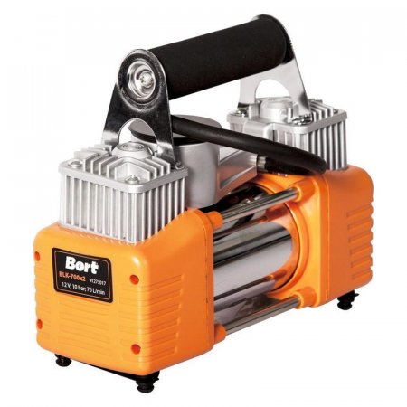 Компрессор автомобильный Bort BLK-700x2 позволит вам с легкостью подкачать шины вашего любимого автомобиля, накачать резиновую лодку, футбольный мяч, матрас или бассейн. С помощью этого высокоэффективного компрессора вы сможете выполнять поставленную задачу без перерыва в течение 30 минут, а это серьёзный показатель. Мощный двухцилиндровый мотор поддерживает давление в 10бар и обладает высокой производительностью 70л/мин, чего вполне достаточно для накачивания автомобильных шин большого размера и надувного плота. Компактная современная модель оснащена ножками, которые выполняют антишумовые и антивибрационные функции, что способствует ее комфортному использованию. Благодаря небольшому весу и эргономичной рукояти, процесс транспортировки становится легче и удобнее. Специальная сумка позволяет надежно хранить прибор в любом помещении. В комплекте поставляется с удобной сумкой, шнуром с зажимами — «крокодилами» для подключения к аккумулятору, 3-мя насадками и спиральным шлангом длиной 5м и манометром.