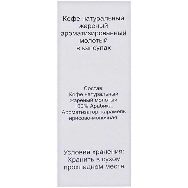 Состав: кофе натуральный жареный молотый 100% арабика, ароматизатор «карамель ирисово-молочная».