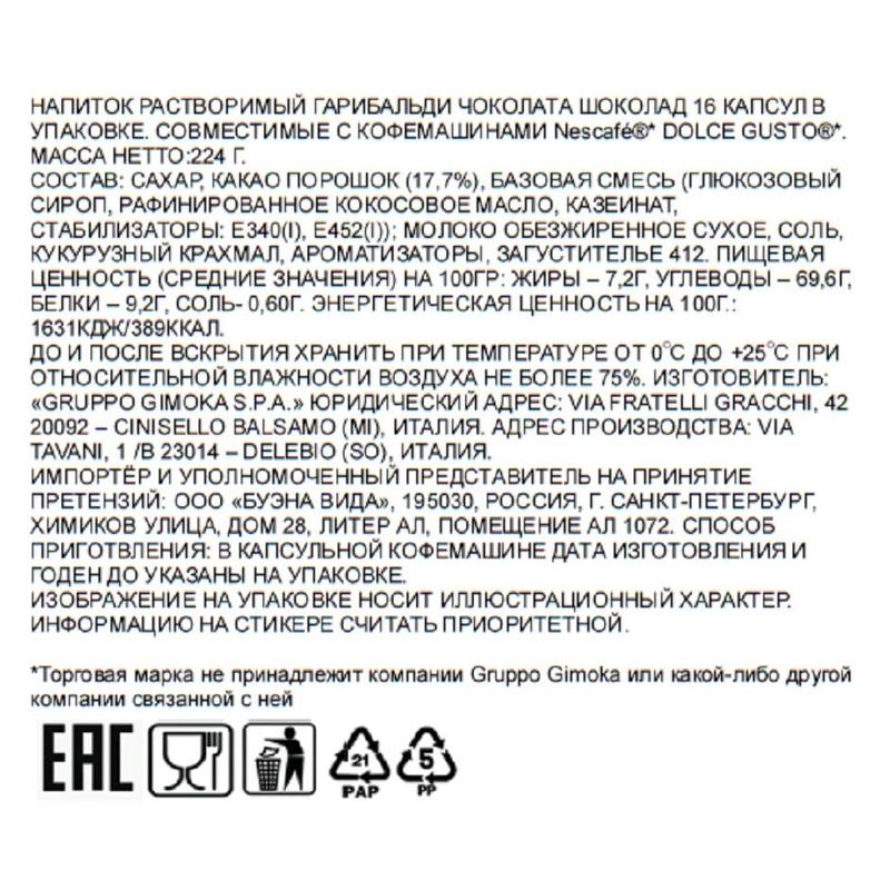 Сладкий и очень нежный шоколадный напиток, с насыщенным вкусом, идеально подходит для того, чтобы перезарядится в течении дня. В коробке содержится 16 капсул, предназначенных для капсульных кофейных аппаратов Dolce Gusto, рассчитанных на приготовление 16 кружек горячего шоколада Garibaldi Cioccolata. Одна капсула горячего шоколада предназначена на чашку объемом 150 мл.Комплектация: 16 капсул по 14 г. Состав: сахар, постный какао-порошок (17.8%), порошок сыворотки, растительный жир (кокос), сироп глюкозы, сухое обезжиренное молоко, белок молоко, соль, стабилизаторы: E415 и E340, ароматизатор, эмульгатор, усилитель клейкости. Срок годности: 18 месяцев. Хранить до и после вскрытия при температуре 0°С до +25°С при относительной влажности не выше 75%, в сухом прохладном месте. Страна происхождения: Италия.