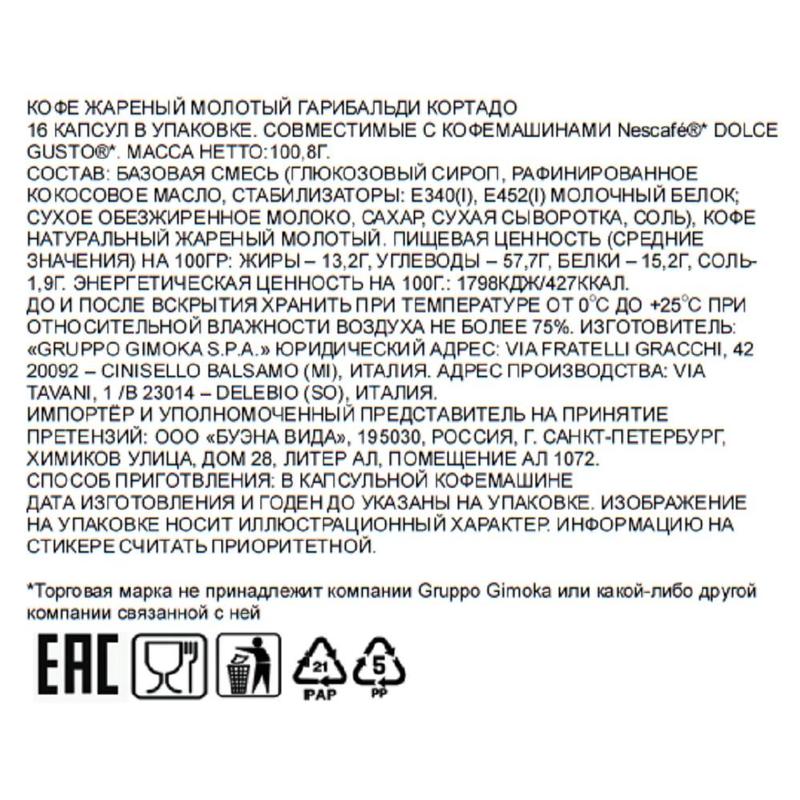 Маленькая капля горячего молока, растворяющегося в кофе эспрессо смягчает его и создает идеальный напиток, подходящий для вечера.В коробке содержится 16 капсул, предназначенных для капсульных кофейных аппаратов Dolce Gusto, рассчитанных на приготовление 16 кружек кофе Garibaldi Cortado. Кофе расфасовано в специальные герметические капсулы и таким образом кофе полностью сохраняет свои характерные свойства даже спустя несколько месяцев. Одна капсула кофе предназначена на чашку объемом 80 мл.Комплектация: 16 капсул по 6,3 г.Состав: цельное сухое молоко (56,3%), молотый кофе (41%), ароматизаторы, стабилизатор: E415, эмульгатор: соевый лецитин.Срок годности: 18 месяцев. Хранить до и после вскрытия при температуре 0°С до +25°С при относительной влажности не выше 75%, в сухом прохладном месте. Страна происхождения: Италия.