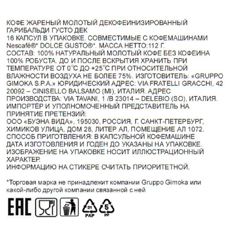 Жаренный молотый кофе без кофеина (содержание кофеина не более 0.1%). Процесс декофеинизирования не влияет на качество кофе и сохраняет идеальный баланс между крепость и его ароматом.В коробке содержится 16 капсул, предназначенных для капсульных кофейных аппаратов Nescafe Dolce Gusto, рассчитанных на приготовление 16 кружек кофе Garibaldi Decaffeinato. Кофе расфасовано в специальные герметические капсулы и таким образом кофе полностью сохраняет свои характерные свойства даже спустя несколько месяцев.Одна капсула кофе предназначена на чашку объемом 35 мл. Интенсивность — 8. Состав: 100% натуральный молотый жареный кофе, 50% арабика, 50% робуста. Срок годности: 24 месяца. Условия хранения: до и после вскрытия хранить при температуре от 0°С до +25°С при относительной влажности воздуха не более 75%. Страна происхождения: Италия.