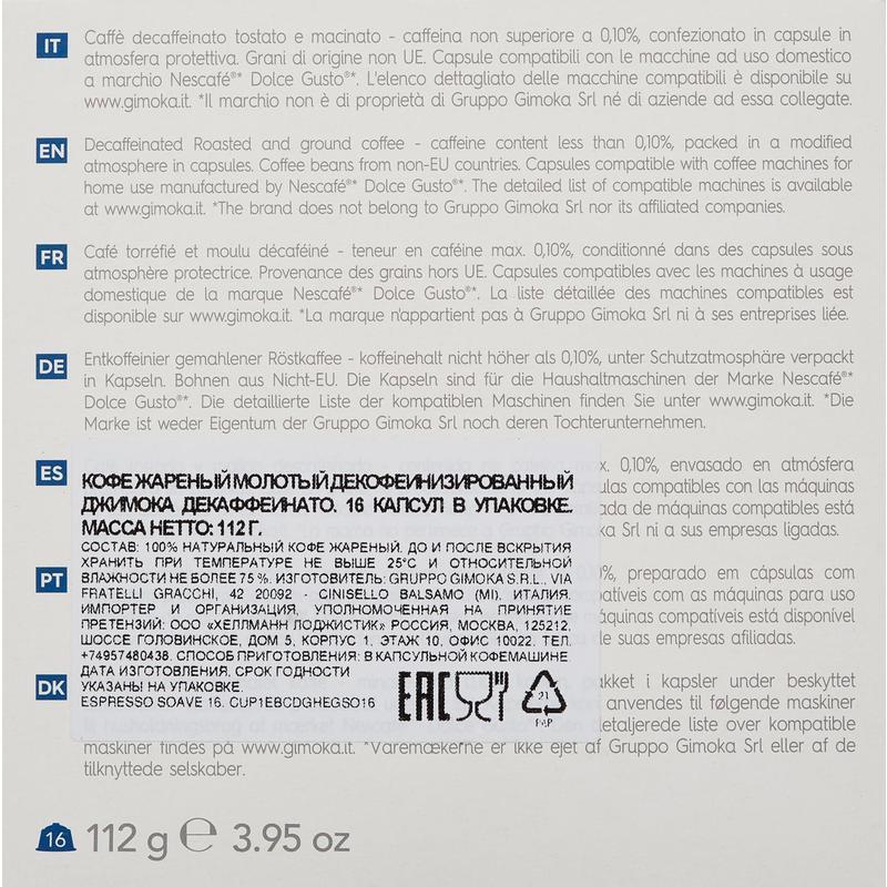Кофе жареный молотый без кофеина Gimoka Dolce Gusto Espresso Soave. Кофе с мягким и нежным вкусом со сливочной текстурой и опьяняющим ароматом, без содержания кофеина.