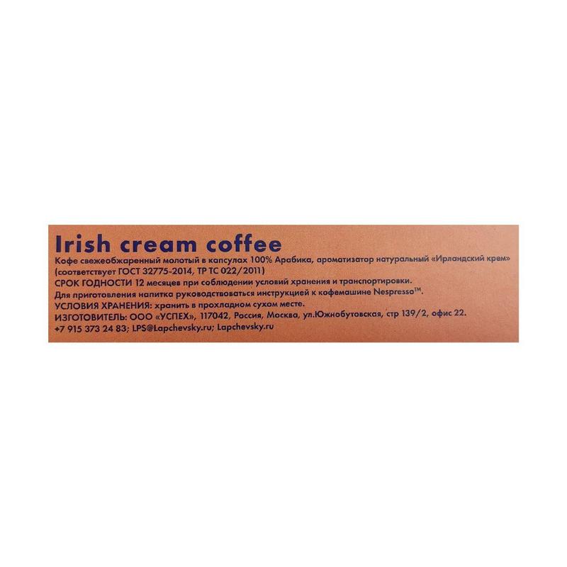 Кофе в капсулах для кофемашины Nespresso. Сбалансированное сочетание аромата, консистенции и вкуса ирландского крема. Средняя обжарка кофе обладает сбалансированным, мягким и насыщенным вкусом. Прекрасно подходит для приготовления лунго и экспрессо или напитков на основе экспрессо (латте, капучино, макиато и др). Сочетается с молоком и сиропом. Ноты: ирландский крем. Рекомендуемый объем чашки: лунго 110 мл; эспрессо 40 мл. Вес кофе в одной капсуле: 5,5 г. Состав: 100% арабика, ароматизатор натуральный «Ирландский крем». Срок годности: 12 месяцев.Хранить в прохладном сухом месте. Страна производства: Россия.