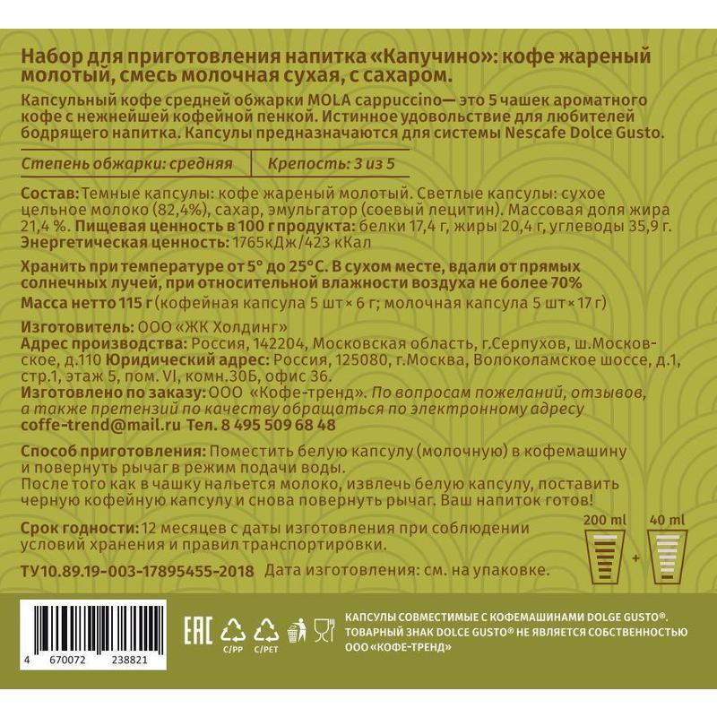 Капсульный кофе средней обжарки Mola Cappuccino— это 6 чашек ароматного кофе с нежнейшей кофейной пенкой. Истинное удовольствие для любителей бодрящего напитка.