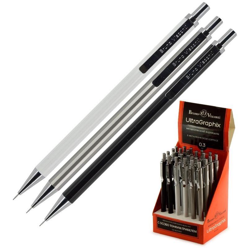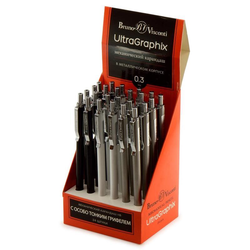 Карандаш механический Bruno Visconti UltraGraphix с толщиной линии письма 0,3 мм. Выполнен в металлической корпусе. Отличается точностью и аккуратностью письма. Снабжен ластиком, который скрыт под нажимным колпачком. Производство: Китай.