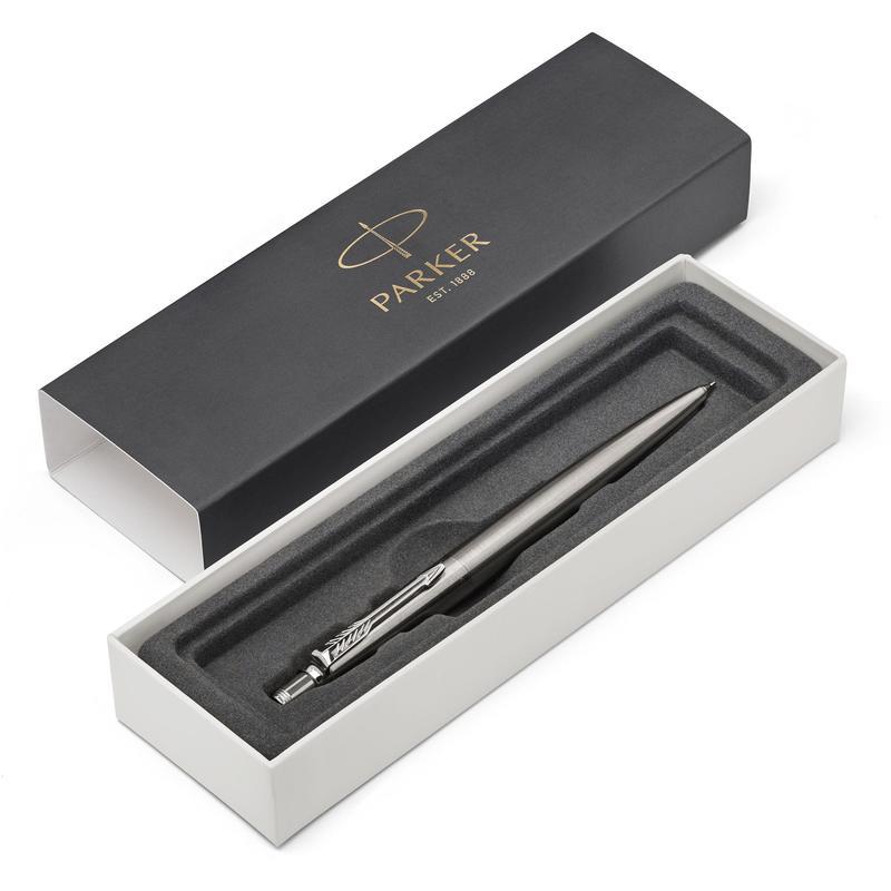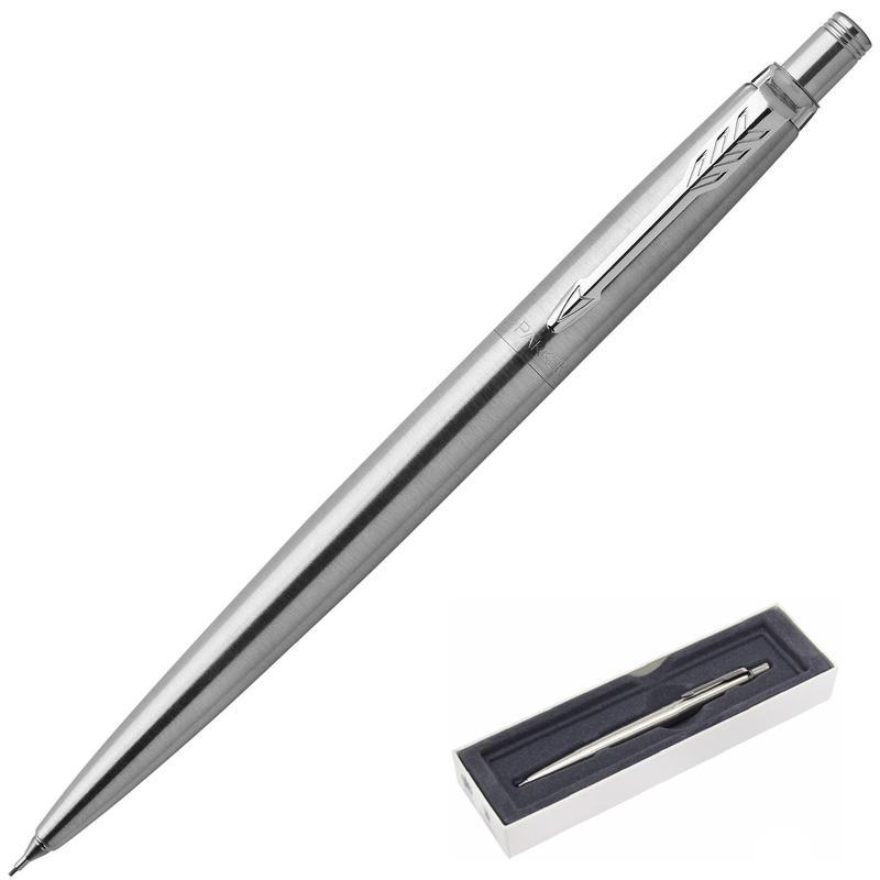 Корпус механического карандаша Parker Jotter сделан из нержавеющей стали, детали отделки — хром. Карандаш обладает нажимным механизмом и толщиной линии письма 0,5 мм.