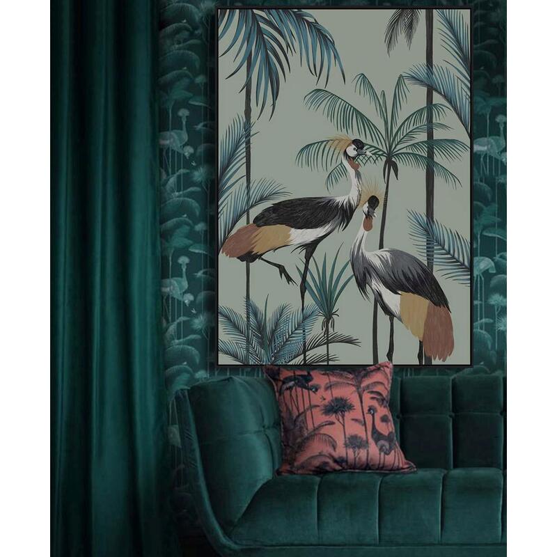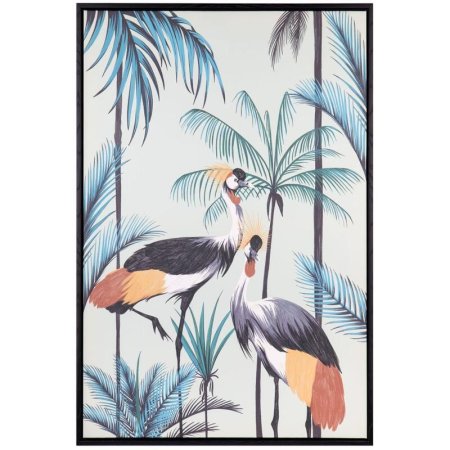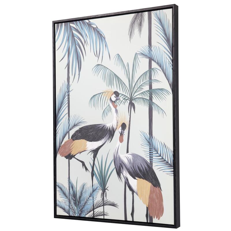 Картина демонстрирует великолепные изображения экзотических птиц и роскошных пальмовых деревьев. Выполненная на высококачественном матовом холсте, она отличается насыщенными красками и детальной проработкой. Деревянный подрамник обеспечивает прочность и устойчивость полотну, а объёмная чёрная рама придаёт ей элегантный, завершённый вид. Размер картины 90×60 см позволяет разместить её как в небольших интерьерах, так и в более просторных помещениях.
