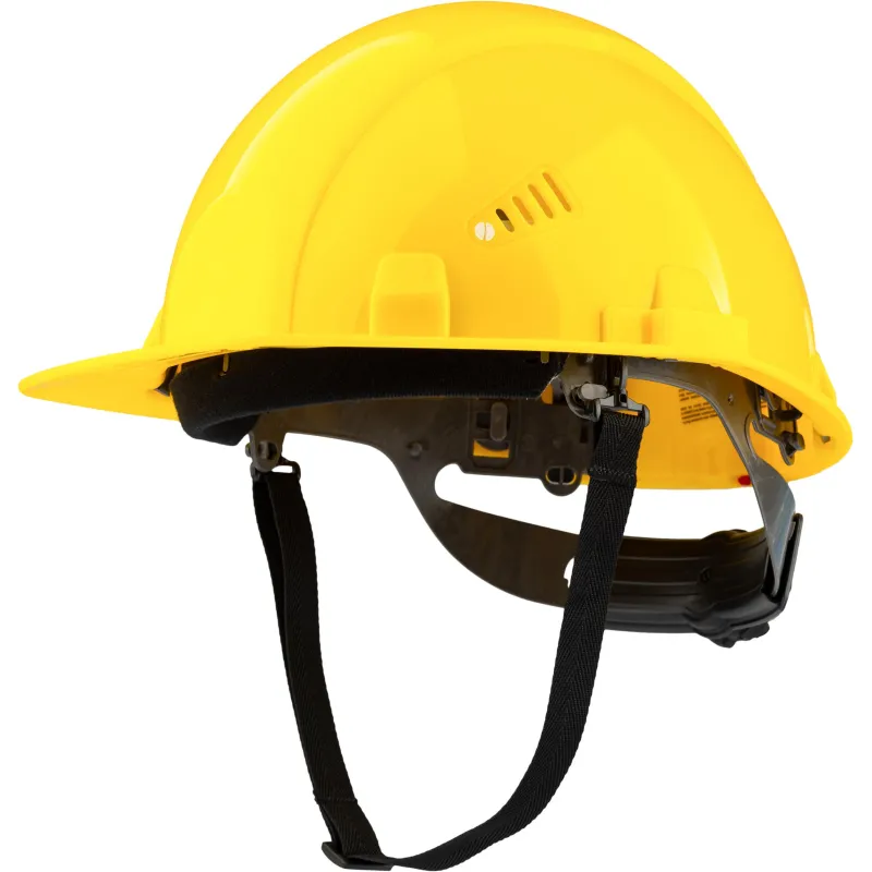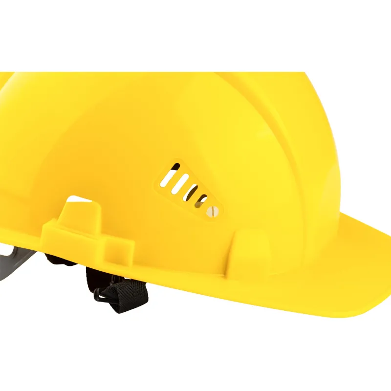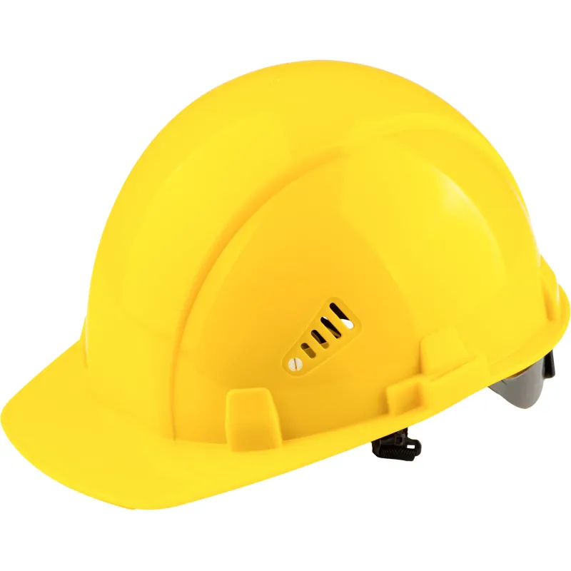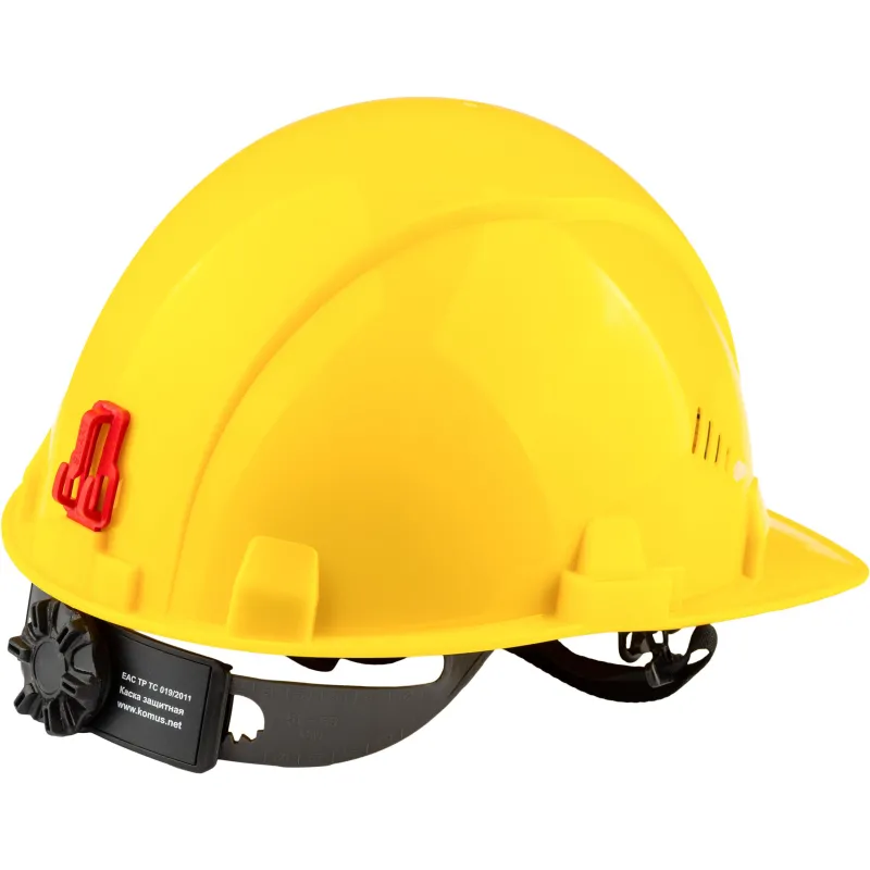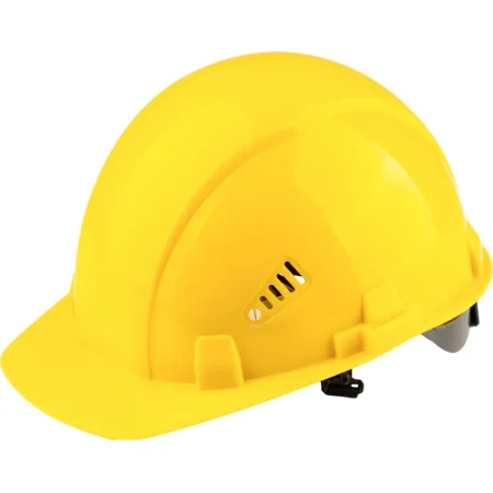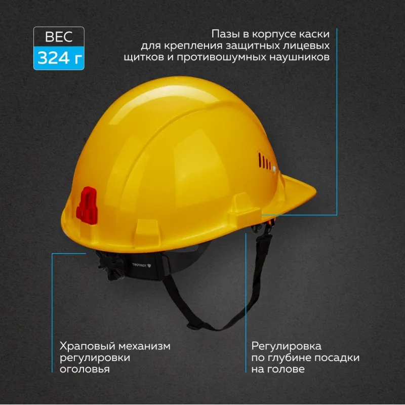 Каска защитная TOPFORT Стандарт 204 желтая с храповым механизмом общего назначения с увеличенным козырьком. Увеличенный козырек защищает от солнца. С помощью храповика можно отрегулировать каску по размеру, не снимая ее с головы. Водосточный желоб по окружности каски. Площадка для нанесения логотипа спереди. Каска обладает тремя ступенями регулировки по глубине посадки на голове. В затылочной части каски установлен держатель для фиксации на каске наголовной ленты закрытых очков. Одновременно с этим держатель является УФ-индикатором старения каски: при воздействии УФ, цвет держателя выгорает, выцветший держатель означает, что нужно сменить каску. В корпусе каски имеются пазы для совместного ношения с защитными лицевыми щитками и противошумными наушниками. Сменная налобная лента (обтюратор) из мягкой ткани для повышения комфорта ношения. Несущая лента внутренней оснастки имеет специальные крючки в затылочной части для крепления пелерины. Поставляется в комплекте с тканиевым подбородочным ремнем и обтюратором.