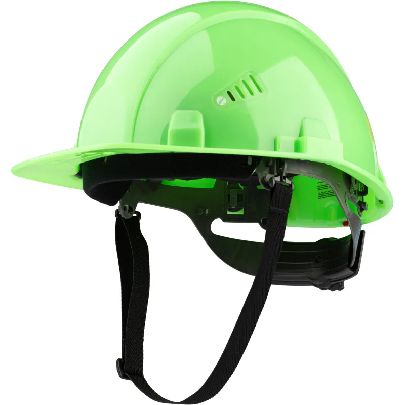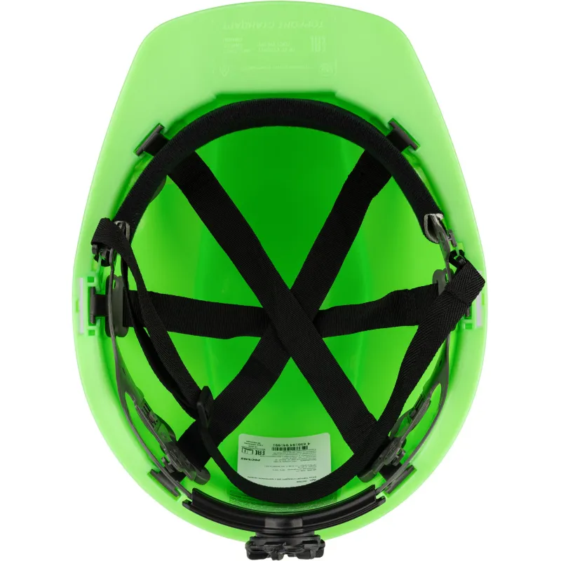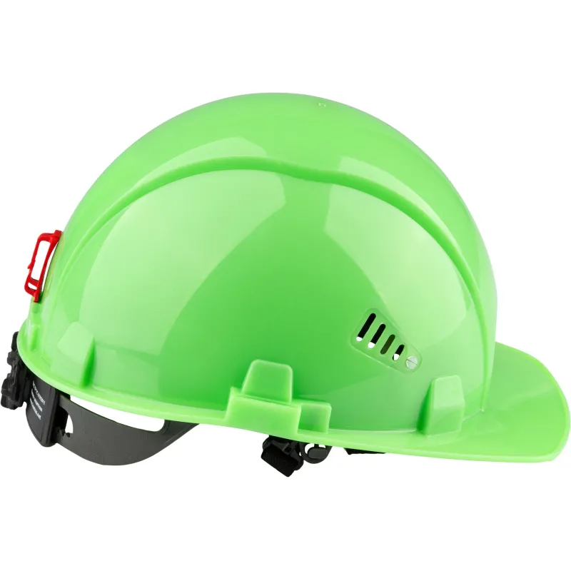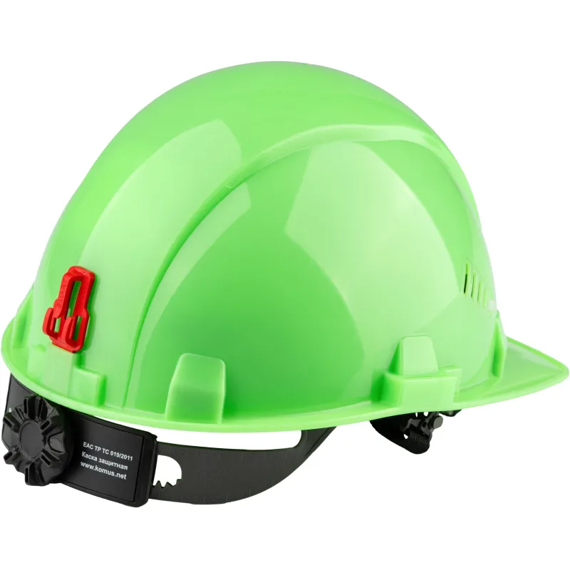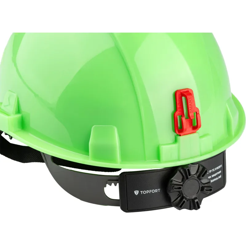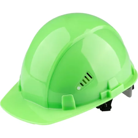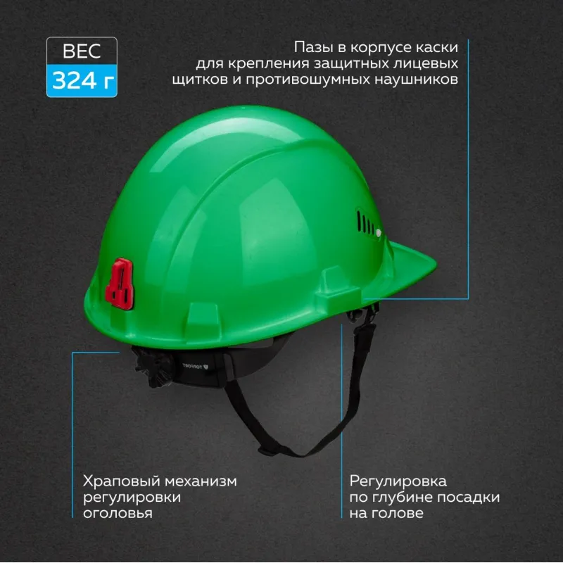 Каска защитная TOPFORT Стандарт 205 зеленая с храповым механизмом общего назначения с увеличенным козырьком. Увеличенный козырек защищает от солнца. С помощью храповика можно отрегулировать каску по размеру, не снимая ее с головы. Водосточный желоб по окружности каски. Площадка для нанесения логотипа спереди. Каска обладает тремя ступенями регулировки по глубине посадки на голове. В затылочной части каски установлен держатель для фиксации на каске наголовной ленты закрытых очков. Одновременно с этим держатель является УФ-индикатором старения каски: при воздействии УФ, цвет держателя выгорает, выцветший держатель означает, что нужно сменить каску. В корпусе каски имеются пазы для совместного ношения с защитными лицевыми щитками и противошумными наушниками. Сменная налобная лента (обтюратор) из мягкой ткани для повышения комфорта ношения. Несущая лента внутренней оснастки имеет специальные крючки в затылочной части для крепления пелерины. Поставляется в комплекте с тканиевым подбородочным ремнем и обтюратором.