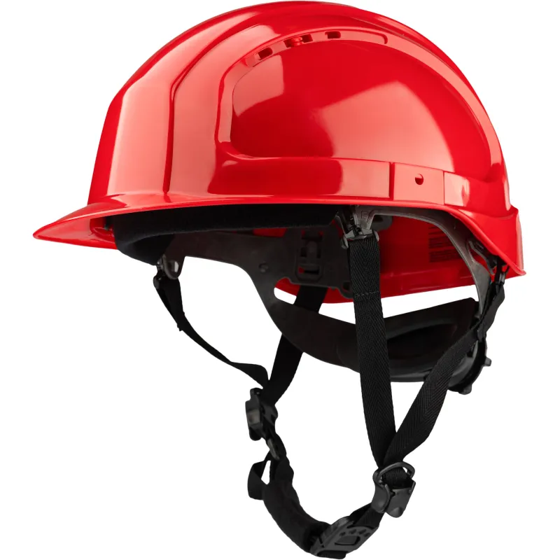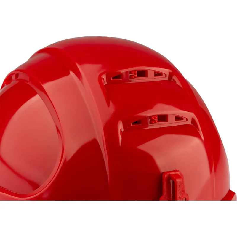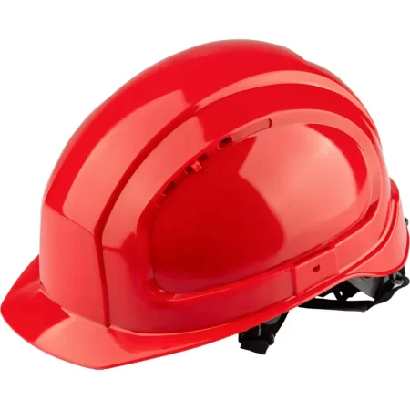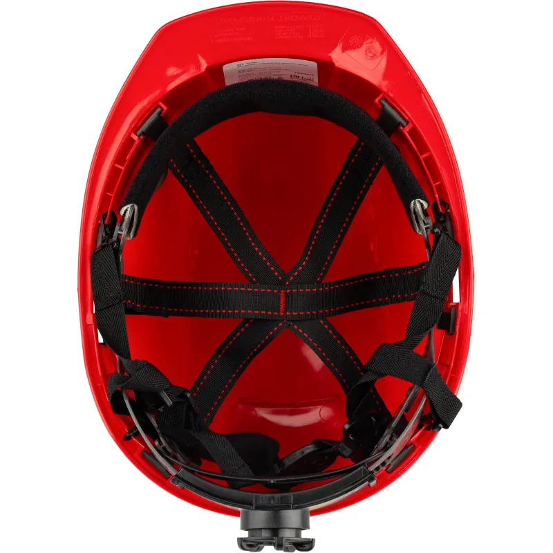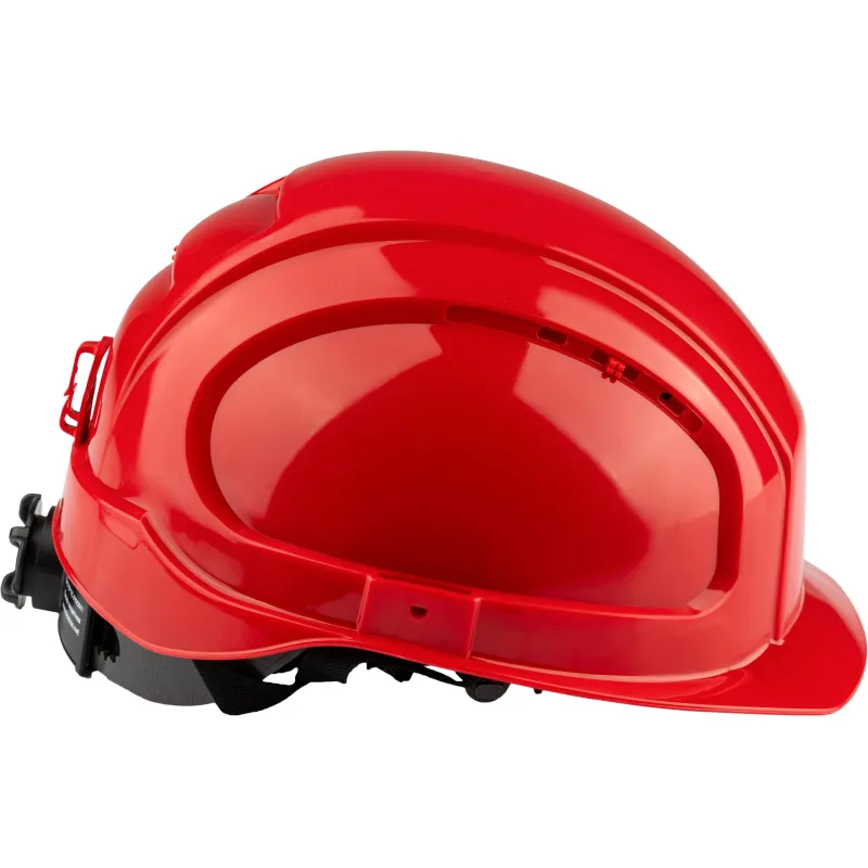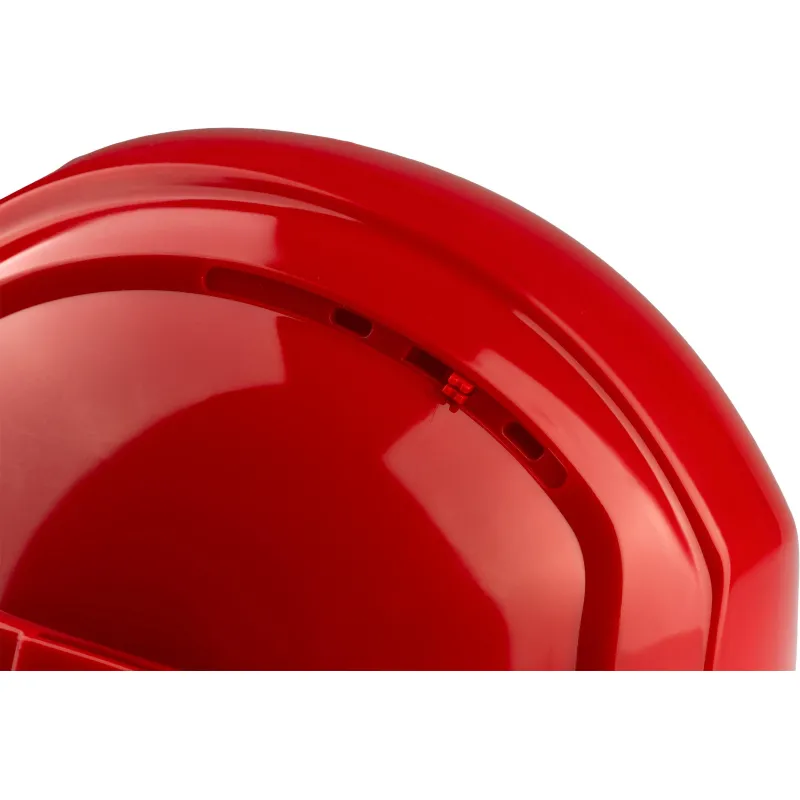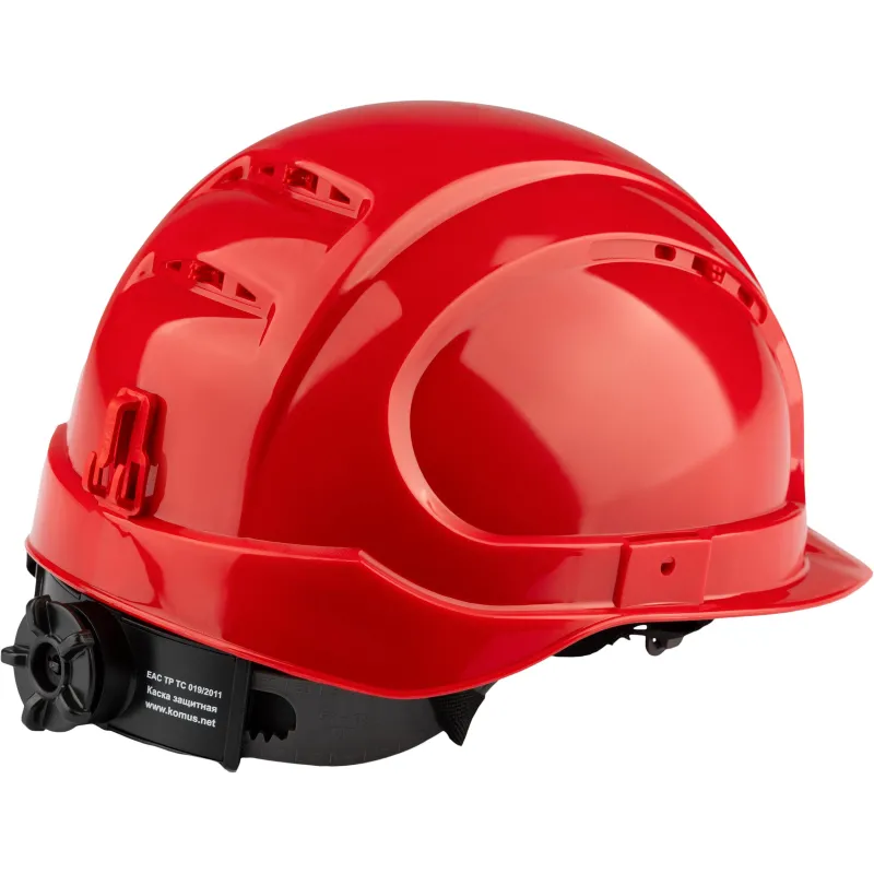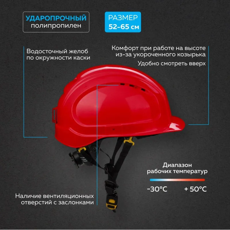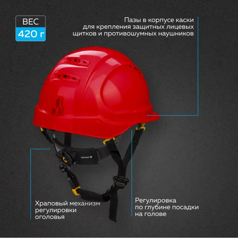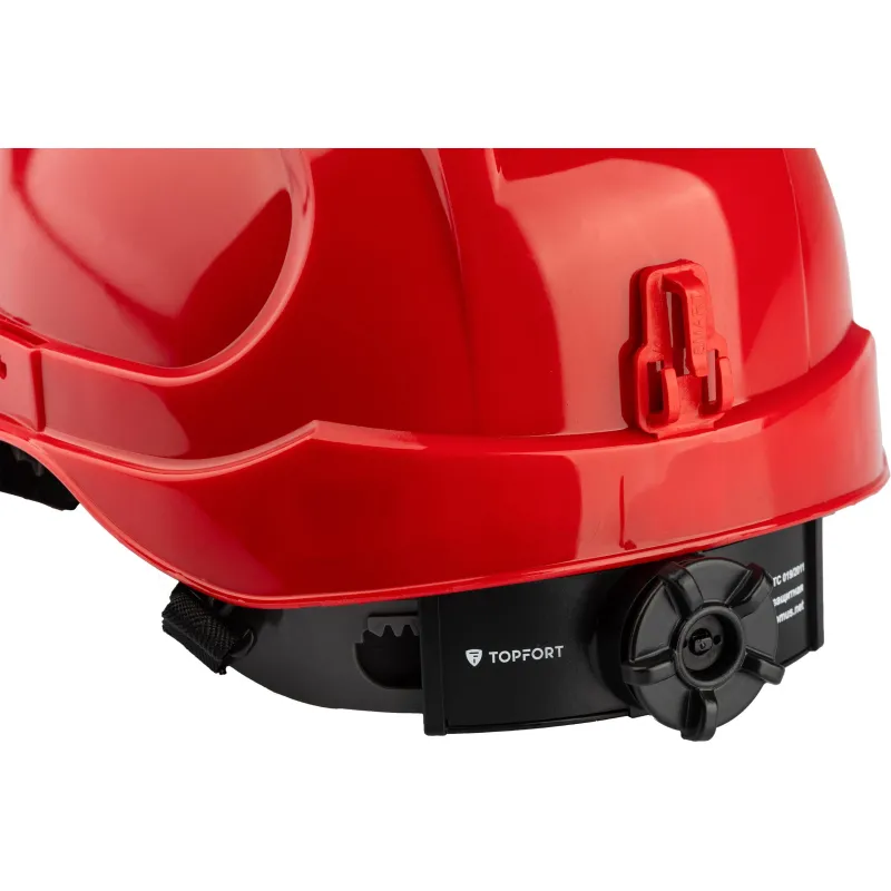 Каска защитная TOPFORT Универсал 303 красная с храповым механизмом для работ на высоте с четыркехточечным подбородочным ремнем. Каска с двойным ребром жесткости, укороченным козырьком, увеличенной защитой затылочной части и храповым механизмом регулировки размера. С помощью храповика можно отрегулировать каску по размеру, не снимая ее с головы. Водосточный желоб по окружности каски. Площадка для нанесения логотипа спереди и с боков. Каска обладает тремя ступенями регулировки по глубине посадки на голове. В затылочной части каски установлен держатель для фиксации на каске наголовной ленты закрытых очков. Одновременно с этим держатель является УФ-индикатором старения каски: при воздействии УФ-лучей, цвет держателя выгорает, выцветший держатель означает, что нужно сменить каску. В корпусе каски имеются пазы для совместного ношения с защитными лицевыми щитками и противошумными наушниками. Сменная налобная лента (обтюратор) из мягкой ткани для повышения комфорта ношения. Несущая лента внутренней оснастки имеет специальные крючки в затылочной части для крепления пелерины. Поставляется в комплекте с 4х точечным текстильным подбородочным ременем, который крепится к корпусу каски при помощи карабина, регулировка по длине осуществляется при помощи пряжки, для быстрого съема каски с головы установлена застежка.