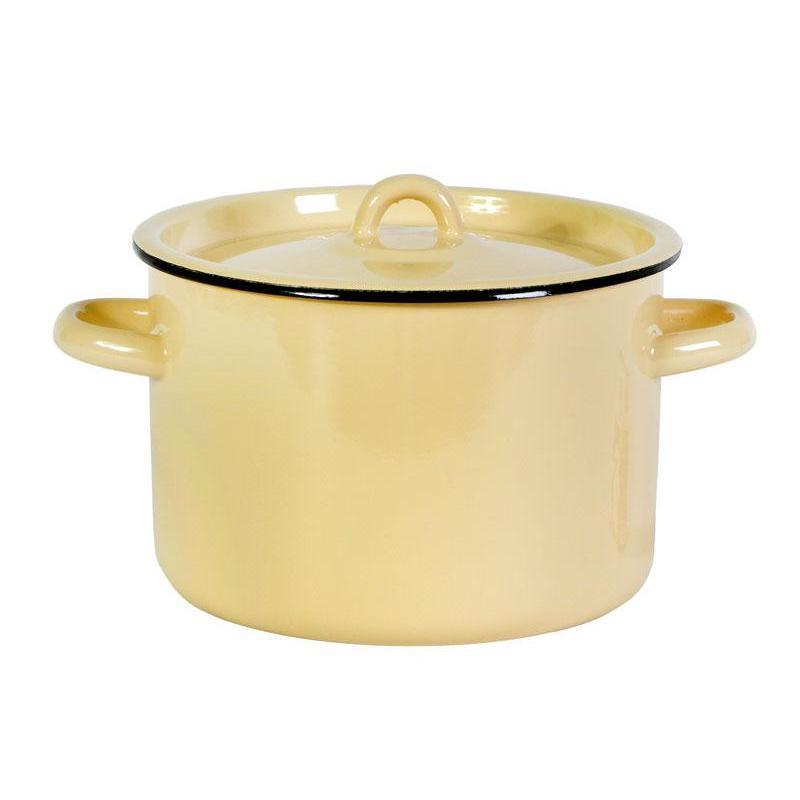 Классическая эмалированная кастрюля с крышкой и металлическими ручками.
