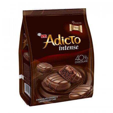 Кексы Eti Adicto Intense mini с кремом в шоколадной глазури 144 г. Состав: кекс 53,1% (масла растительные (пальмовое, подсолнечное, хлопковое, рапсовое), пшеничная мука (содержит глютен), яйца, сахар, инвертный сахарный сироп, горький шоколад 5,5% (сахар, какао-масса, какао масло, какао, эмульгаторы (подсолнечный лецитин, Е 476), ароматизатор (ванилин). Массовая доля общего сухого остатка какао-продуктов — не менее 52%), какао, влагоудерживающий агент (E 422, E 420), эмульгаторы (E 471, E 475), соль, разрыхлители (E 450, E 500), консервант (E 200), ароматизатор (ванилин), загуститель (E 415), регулятор кислотности (лимонная кислота)), молочный шоколад 31,9% (сухое молоко, моногидрат лактозы (молочный продукт), сыворотка молочная сухая (молочный продукт), какао-масса, сахар, какао масло, ароматизатор (ванилин), эмульгаторы (подсолнечный лецитин, Е 476). Массовая доля общего сухого остатка какао-продуктов — не менее 32%), шоколадный крем 12,5% (горький шоколад 19,4%, молочный шоколад 19,4%, инвертный сахарный сироп, влагоудерживающий агент (E 422, E 420), сахар, сухое обезжиренное молоко, сыворотка молочная сухая (молочный продукт), загуститель (E 440), эмульгаторы (E 471), соль, стабилизаторы (E 333, E 331), консервант (E 200), декор горький шоколад 2,5% (сахар, какао-масса, какао масло, сливочное масло (молочный продукт), моногидрат лактозы (молочный продукт), какао, эмульгаторы (подсолнечный лецитин, Е 476), ароматизатор (ванилин). Массовая доля общего сухого остатка какао-продуктов — не менее 52%. Пищевая ценность: белки — 5,1 г, жиры — 27 г, углеводы — 51 г. Энергетическая ценность: 473 ккал. Хранить при температуреот 18 до 21градус.С, относительной влажности воздуха не более 75%. Страна производства: Турция.