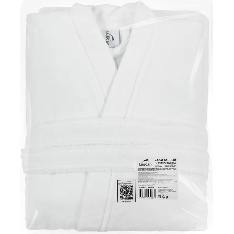 Банный халат марки Luscan выполнен из микровелюра белого цвета, что придаёт ему стильный и современный вид. Халат удобно сидит, плотность ткани составляет 300 г/кв.м. Он идеально подходит для использования в отельном бизнесе благодаря своему качественному материалу и элегантному дизайну. Микровелюр мягкий и приятный на ощупь.