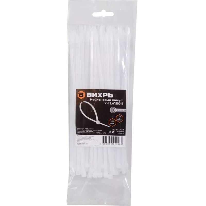 Хомут (стяжка) пластиковый Вихрь 200×3.6 мм белый 100 штук — соединительный элемент, применяется для крепления и фиксации различных конструкций, систем монтажа, электропроводки и многого другого. Может использоваться при маркировке электромонтажных кабелей, т.к хомут одновременно выполняет функции крепежного изделия и стяжки для электропроводов. Хомуты являются достаточно быстрым и удобным способом крепления и бандажирования, также их можно использовать как в помещении, так и за его границами.