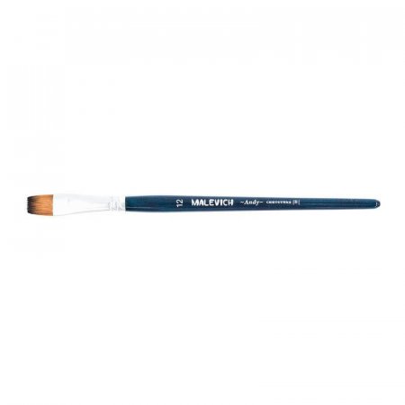 Кисть из синтетики Andy, плоская № 12. Кисть из синтетики серии Andy — это мягкая универсальная синтетика, которая подходит практически для любых видов красок. Ей удобно работать с гуашью, акварелью, акрилом, темперой. Маслом можно работать в лессировочной технике с разбавителем. Синтетика рыжего цвета с темным кончиком, ручка покрыта синим лаком, ворс закреплен втулкой из латуни с двойной обжимкой. Ручка кисти короткая — 14 см. Длина ворса (выставка) короткая. Номер кисти соответствует диаметру пучка в мм.