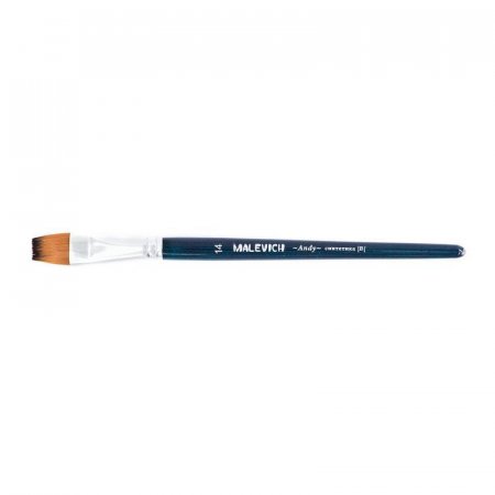 Кисть из синтетики Andy, плоская № 14. Кисть из синтетики серии Andy — это мягкая универсальная синтетика, которая подходит практически для любых видов красок. Ей удобно работать с гуашью, акварелью, акрилом, темперой. Маслом можно работать в лессировочной технике с разбавителем. Синтетика рыжего цвета с темным кончиком, ручка покрыта синим лаком, ворс закреплен втулкой из латуни с двойной обжимкой. Ручка кисти короткая — 14 см. Длина ворса (выставка) короткая. Номер кисти соответствует диаметру пучка в мм.