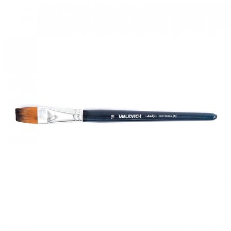 Кисть из синтетики Andy, плоская № 18. Кисть из синтетики серии Andy — это мягкая универсальная синтетика, которая подходит практически для любых видов красок. Ей удобно работать с гуашью, акварелью, акрилом, темперой. Маслом можно работать в лессировочной технике с разбавителем. Синтетика рыжего цвета с темным кончиком, ручка покрыта синим лаком, ворс закреплен втулкой из латуни с двойной обжимкой. Ручка кисти короткая — 14 см. Длина ворса (выставка) короткая. Номер кисти соответствует диаметру пучка в мм.