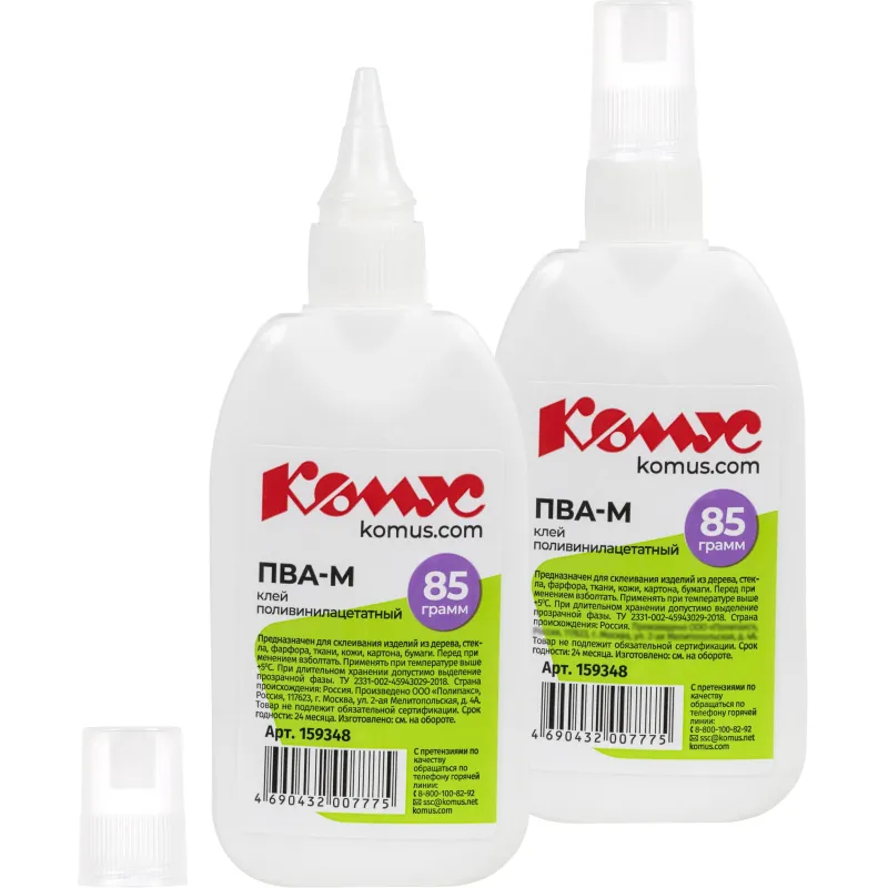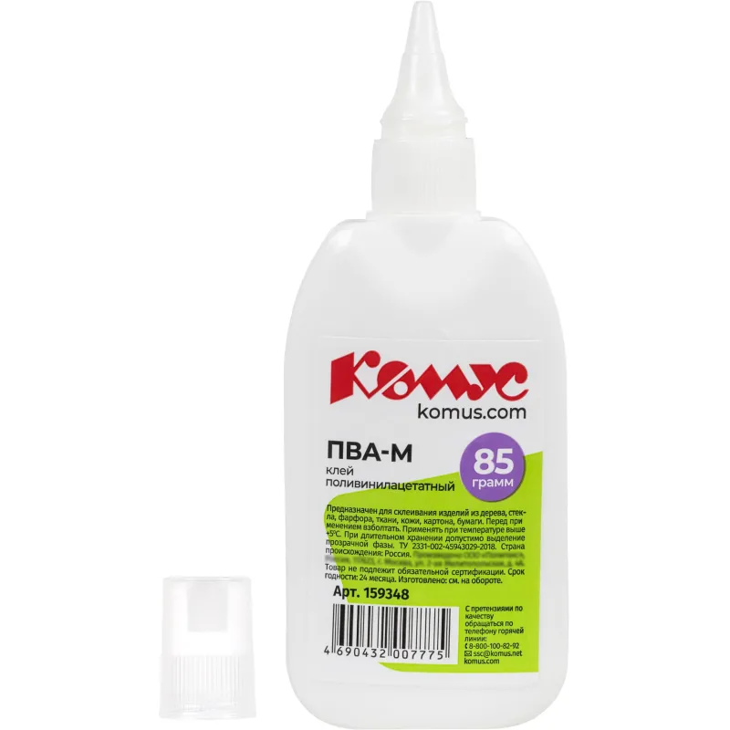 Клей ПВА Комус предназначен для склеивания бумаги, картона, фото, дерева, кожи, ткани, пробки. Отлично подходит для хобби и творчества для взрослых и детей. Пластиковый дозатор обеспечивает точное нанесение и экономный расход. Имеется съемный колпачок, который предохраняет клей от засыхания.Объем клея 85 г (80 мл).Клей ПВА при минусовых температурах замерзает, т.к. сделан на основе воды, но при оттаивании не теряет своих свойств. Его можно заморозить и размораживать 5 раз при температуре до −25°С, и он не потеряет ни своих свойств, ни товарного вида. Температура воздуха при использовании не ниже +5. Необходимо взболтать перед применением.