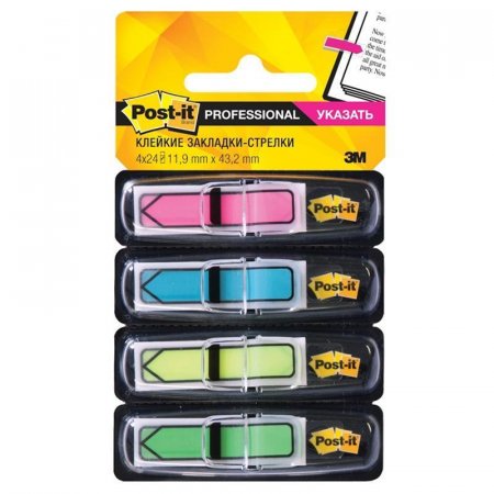 Самоклеящиеся закладки Post-it помогают выделить и систематизировать нужную информацию в документах, книгах, журналах. Выполнены из тонкого пластика в виде стрелок, ширина — 12 мм. Подходят для нанесения надписей, могут многократно переклеиваться без повреждения поверхностей. В наборе — закладки четырех «неоновых» цветов по 24 штуки каждого. Удобные пластиковые диспенсеры позволяют извлекать их по одной. Цвета: розовый, голубой, желтый, зеленый.