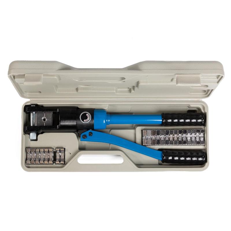 Пресс ручной гидравлический, используется для обжима медных и алюминиевых наконечников в диапазоне от 10 до 300 кв.мм. Для удобства и эффективной работы модель оснащена двухскоростной помпой и клапаном сброса давления, а ручки имеют чехлы эргономической формы. Поставляется в удобном кейсе. Материал рабочих частей — высококачественный металл. Внешний вид и/или характеристики товара могут быть изменены производителем в соответствии с производственным процессом.
