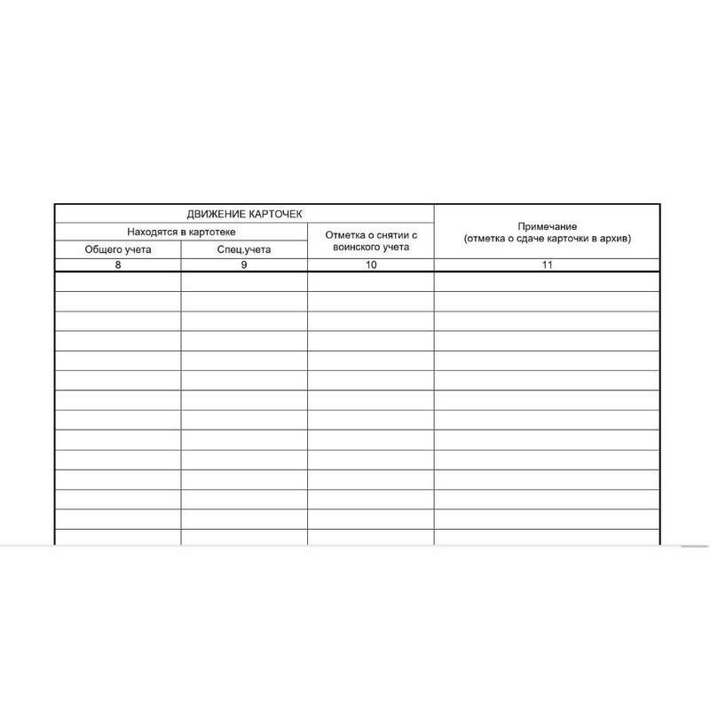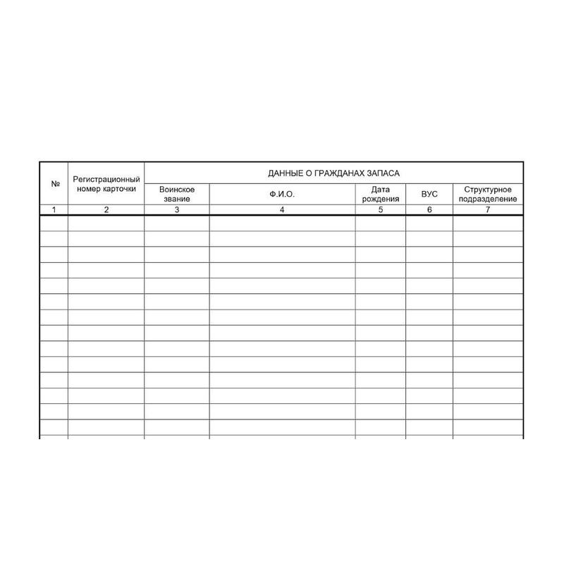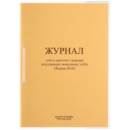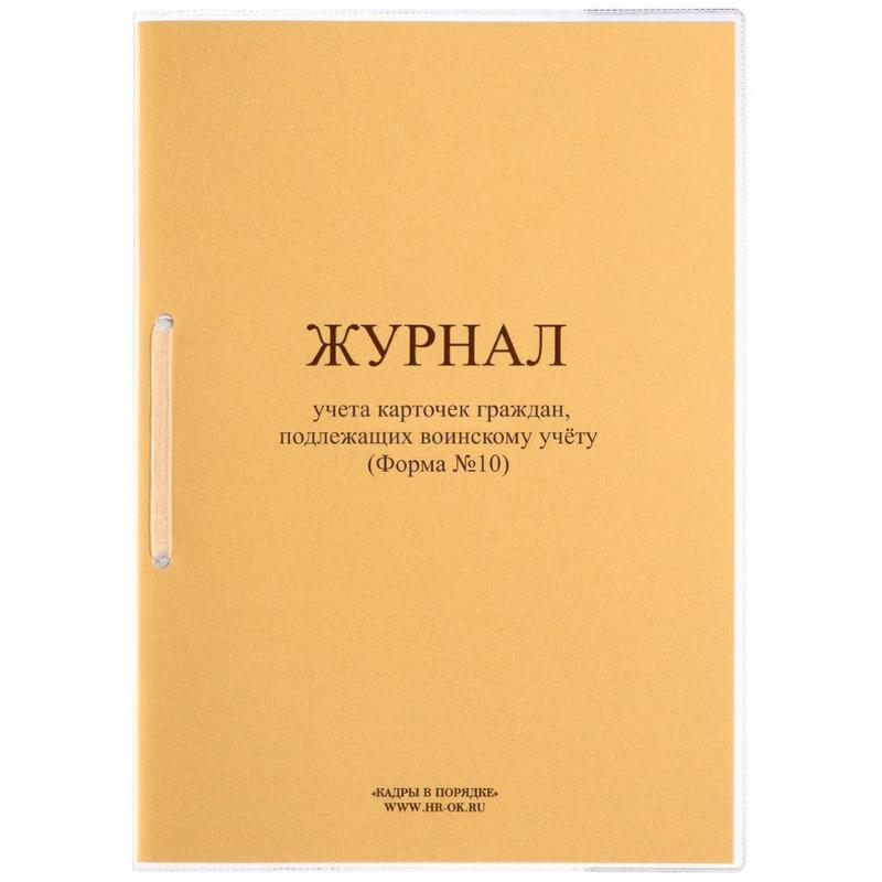Журнал учета карточек граждан, подлежащих воинскому учету (Форма 10) применяется для ведения воинского учета в организации, соответствует «Инструкции об организации работы по обеспечению функционирования системы воинского учета» (утв. приказом Министра обороны РФ от 22 ноября 2021 г. N 700).Журнал создан в соответствии с нормативными документами: Приложение N 5. Журнал учета личных карточек формы Т-2 (Т-2ГС) на граждан РФ, пребывающих в запасе; Методические указания по организации и ведению воинского учета и бронирования граждан Российской Федерации, пребывающих в запасе, и работающих в исполнительных органах государственной власти Санкт-Петербурга и организациях Санкт-Петербурга, деятельность которых связана с деятельностью указанных органов или которые находятся в сфере их ведения.Журнал содержат следующие графы:— Порядковый номер записи;— Регистрационный номер карточки.Данные о гражданах запаса:— Воинское звание;— ФИО;— Дата рождения;— ВУС;-Структурное подразделение.Движение карточек:— Находятся в картотеке общего учета; — Находятся в картотеке специального учета;— Отметка о снятии с воинского учета.— Примечание (отметка о сдаче карточки в архив).Журнал должен быть зарегистрирован, пронумерован, прошнурован, опечатан и заверен подписью руководителя организации.Материал обложки — картон. Внутреннего блок — офсетная бумага, 80 г/кв.м, 32 листа.Журнал учета, прошнурован, пронумерован, опломбирован номерной голографической пломбой. Бумага белая, качественная. Обложка — золотистый картон. Дополнительно съемная обложка из прозрачного ПВХ.