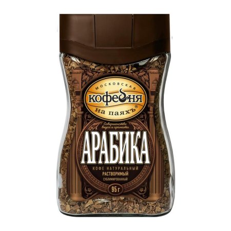 Кофе Московская кофейня на паяхъ «Арабика» приготовлен исключительно из премиальных сортов Арабики. Богатый аромат, насыщенный вкус и продолжительное послевкусие. Этот напиток выбирают многие офисные коллективы, дружные студенческие компании, большие и маленькие семьи и т. д. Московская кофейня на паяхъ создает качественный кофе благодаря неизменным составляющим: квалифицированные специалисты с большим опытом работы, современное высокотехнологичное оборудование и любовь к своему делу.Состав: 100% арабика;Степень обжарки/вид кофе: средняя;Способ приготовления: добавить в чашку 1–2 чайные ложки кофе и залить горячей, но не кипящей водой.Вес: 95 г;Тип упаковки: стеклянная банка;Условия хранения: Хранить при температуре не выше 20’С относительной влажности не более 75%;Страна производства: Россия;