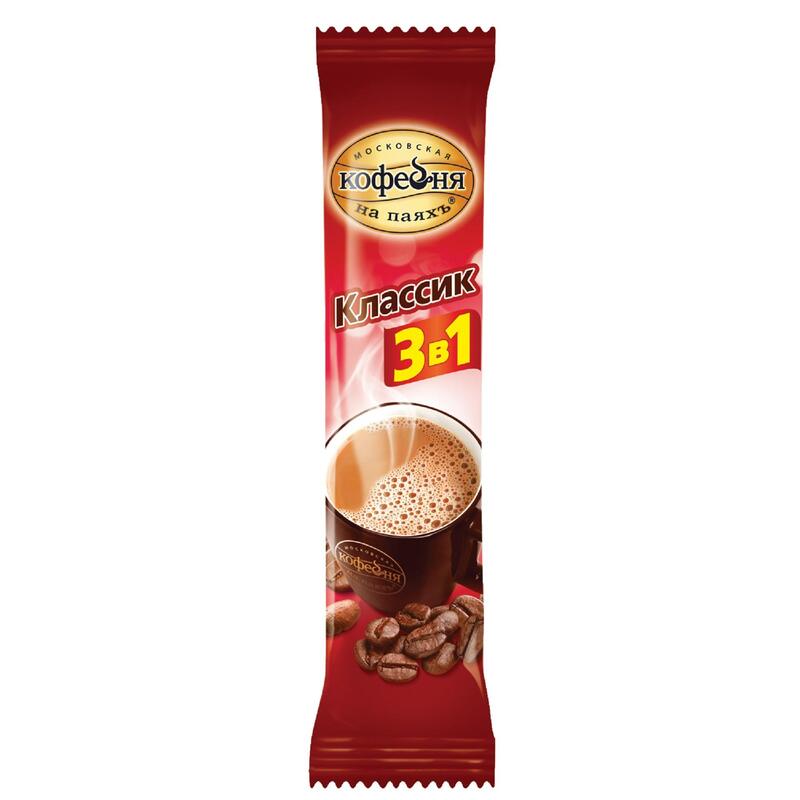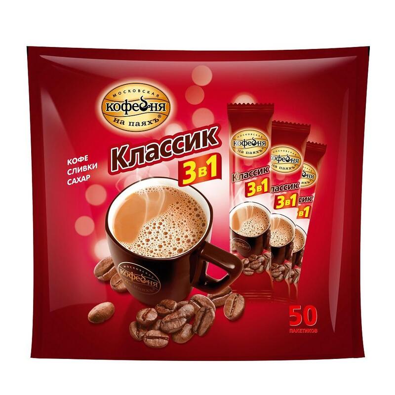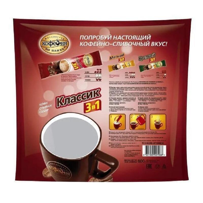 Напиток кофейный растворимый «Московская кофейня на паяхъ» — сбалансированный вкус и аромат благодаря классическому сочетанию натурального кофе, сливок и сахара! Понравится тем, кто ищет не слишком сладкий кофе 3 в 1. Кофейный напиток обладает насыщенным вкусом и чудесным бодрящим ароматом. Удобная упаковка в форме порционных пакетиков позволит насладиться восхитительным кофейным ароматом и классическим вкусом кофе, где и когда удобно.Состав: сахар, заменитель сухих сливок на растительной основе (патока крахмальная, масло пальмовое, эмульгаторы (Е471, Е481), стабилизаторы (Е340, Е452), казеинат натрия, агент антислеживающий Е551), кофе натуральный растворимый порошкообразный, соль поваренная пищевая, ароматизатор.Степень обжарки / вид кофе: средняя обжарка.Способ приготовления: взять пакетик, налить 150 мл горячей воды и размешать.Вес: 800 г.Количество пакетиков в упаковке: 50 штук.Тип упаковки: вакуумный пакет.Условия хранения: При температуре до 20 °С, с относительной влажностью воздуха не более 75%.Страна производства: Россия.