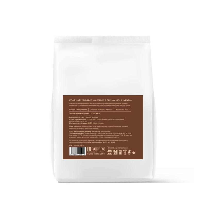 Кофе Mola Venza в зернах 200 г. Смесь с густой бархатной высокой пенкой, обладает многогранным пряным ароматом, плотным насыщенным вкусом и долгим насыщенным послевкусием.