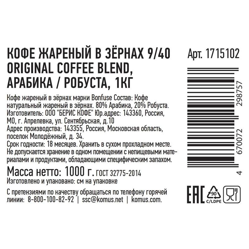 Original coffee blend — это коллекция блендов (купажей) зернового кофе из разных стран, созданная при участии сертифицированных бариста и судей кофейных чемпионатов.Работа высокопрофессиональной команды прослеживается на всех этапах производства продукции. Важным этапом является не только выбор используемого сырья, но и сам процесс обжарки. Обжарка смесей осуществляется под тщательным контролем, что позволяет сделать напиток изысканным и тонко передающим нюансы вкуса и аромата. Каждый бленд отличается не только сортовым составом, но и способом обжарки.Бленд 9/40 раскрывается нотами сладкой карамели, фундука и чернослива.Состав: 80% арабика, 20% робуста.Степень обжарки: средняя.Способ приготовления: после помола возьмите 1–2 чайные ложки кофе из расчета на чашку воды 50 мл и приготовьте напиток привычным способом: в турке, чашке, кофеварке, во френч-прессе. При приготовлении в кофемашине следуйте рекомендациям ее производителя.Вес: 1000 г.Тип упаковки: вакуумный пакет с клапаном для дегазации.Срок годности: 18 месяцев.Условия хранения: в сухом прохладном месте при температуре не выше 27 °С и относительной влажности воздуха не более 75%.