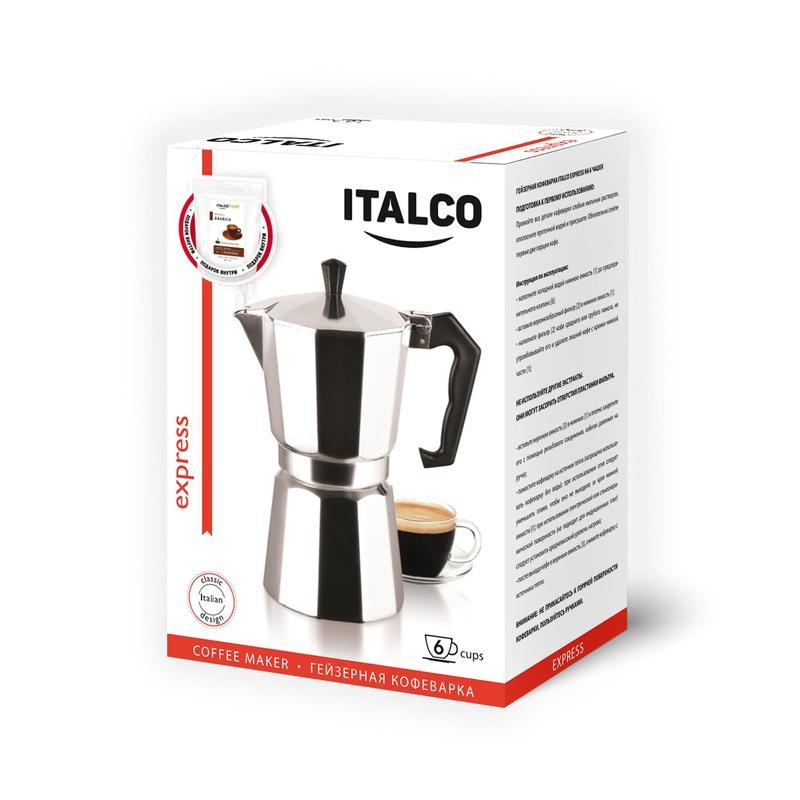 Промо набор для любителей кофе! Italco Express — Классическая гейзерная кофеварка. Отличается высокой надежностью и позволяет быстро приготовить крепкий и насыщенный кофе. Подходит для всех типов нагревающих поверхностей, кроме индукционных плит. В качестве дополнения к кофеварке предлагается 90 г кофе в зернах Italco Arabica Brazil, который уже вложен в потребительскую упаковку.