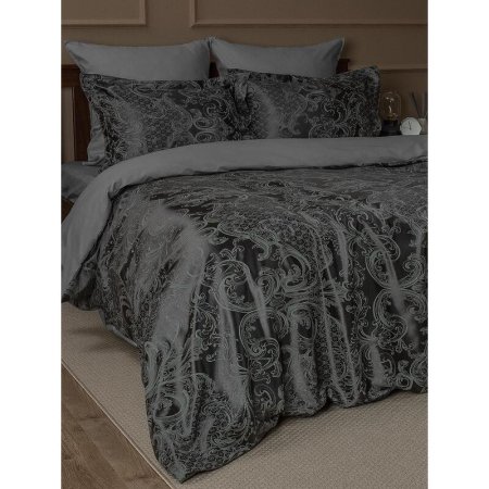 Постельное белье Buenas Noches черное/серое (евро, сатин).Роскошное постельное белье торговой марки Buenas Noches относится к категории премиум. Благодаря современному производству оно надолго сохраняет свою красоту, даже при многочисленных стирках. Комплект производится из двух видов тканей — верхняя сторона (лицевая сторона пододеяльника и декоративных наволочек) выполнена из жаккардовой ткани с благородным, фактурным тканым орнаментом (65% хлопок, 35% полиэстер); внутренняя часть (простыня, оборотная сторона пододеяльника, большие наволочки и обратная сторона декоративных наволочек) — из высококачественного хлопкового, однотонного сатина (100% хлопок). Сочетание роскошного жаккардового полотна с отменным хлопковым сатином дарят ощущение аристократической изящности и комфорта. Постельное белье из жаккарда по праву называется королевским. В комплект постельного белья входят:— простынь 240×260 см;— пододеяльник 205×260 см;— 2 наволочки 70×70 см и 2 наволочки 50×70 см.Перед первым использованием комплект рекомендуется постирать при 30 градусах, используя мягкие средства для стирки без содержания отбеливающих веществ.Упаковка: картонная коробка.