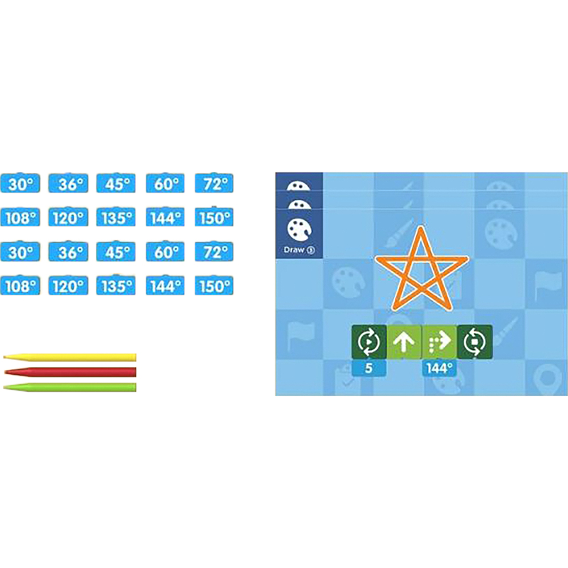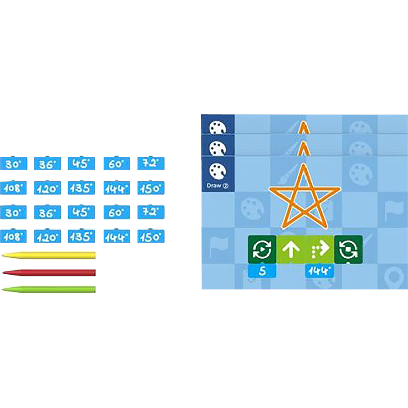Комплектация: 10 блоков с углами поворотов, 3 фломастера, карточки с примерами рисунков и программ.