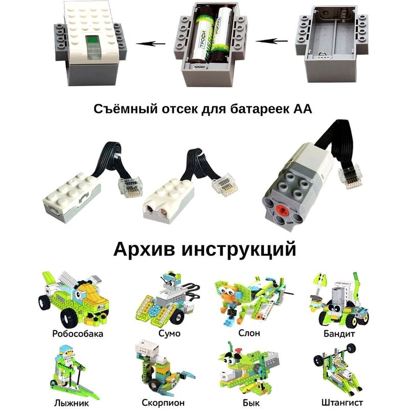 В наборе представлен большой выбор деталей: пластины, оси, приводные ремни, колеса обычные с резиновым покрытием и зубчатые колеса, которые используются для передачи движения. Блоки разных размеров, цветов и форм (квадратные, прямоугольные). Все детали удобно хранятся во вместительном контейнере с крышкой. Совместим и взаимозаменяем с серией Duplo.