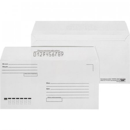 Конверты EcoPost формата Е65 (размер 110x220 мм) выполнены из офсетной бумаги плотностью 80 г/кв.м. Имеют почтовый подсказ «Куда-Кому». Без внутренней запечатки. Тип заклеивания — клеевое нанесение ’стрип’ (отрывная силиконовая лента). Конверты предназначены для почтовых отправлений различной документации, писем и т.п. Поставляются по 1000 штук в упаковке. Данные конверты относятся к сегменту эконом, изготовлены из бумаги с пониженными требованиями к качеству. В связи с этим не рекомендуется использовать их для печати на принтерах — возможна неточная цветопередача и расплывчатость элементов изображения, а также загрязнение рабочих узлов принтера бумажной пылью. Визуально бумага может выглядеть более тонкой по сравнению со стандартными конвертами, хотя имеет такую же плотность.